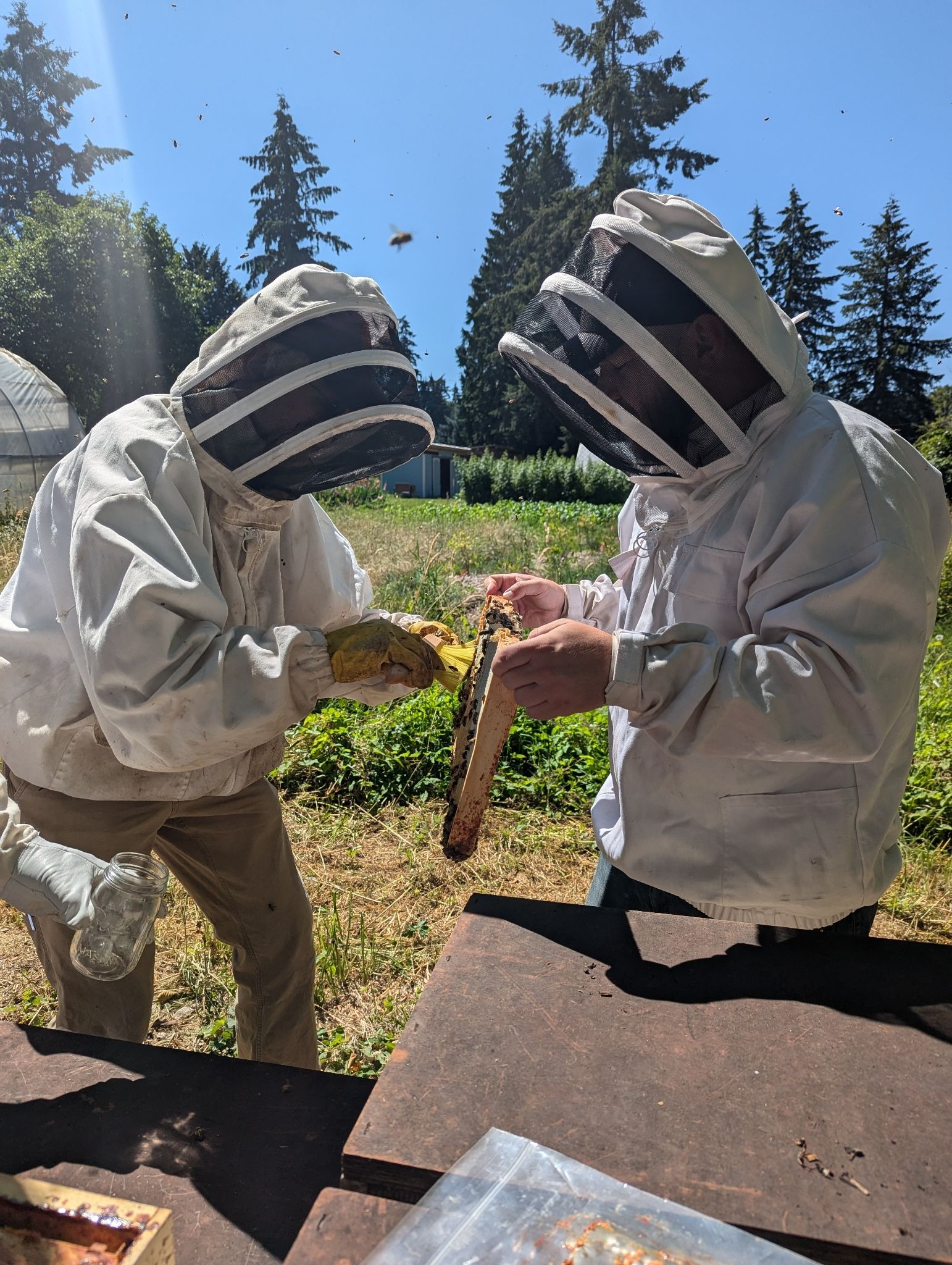 In 2019, the Victory Farm also got its first beehives! Local master beekeeper and president of the Washington State Beekeepers Association, and Army Veteran, Alan Woods, reached out to GRuB and offered to introduce hives and mentor Veterans in beekeeping at the Victory Farm. GRuB partnered with Woods, the WA State Beekeepers Association, and the WA Farmer Veteran Coalition (WA-FVC) to launch Healing Through Hives in 2021, funded by a 4-year grant from the USDA. Around the same time, we co-created the Shepherd Project with WA-FVC and Boeing to support Veterans entering agriculture. Through the Healing Through Hives and Shepherd projects, the Veterans Program holistically supported Veteran beekeepers and farmers to get started in agriculture with education, mentorship, hands-on workshops, and community support.